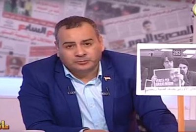 ظهر الإعلامي جابر القرموطي، بلافتات على الهواء، تحمل صورًا لنواب البرلمان الأوروبي وهم رافعون صورًا لطالب الإيطالي جوليو ريجيني، الذي لقي حتفه في الثامن والعشرون من شهر يناير الماضي، على إحدى جوانب الطرق المصرية.