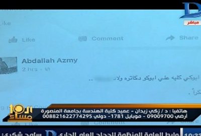 من جهة أخرى، قال زكي زيدان، عميد كلية الهندسة بجامعة المنصورة، إن الشتائم التي وجهها الطالب لأساتذة الكلية سببت جرح عميق لهم، مضيفًا خلال اتصال هاتفي ببرنامج “العاشرة مساءً”، إن الطالب اعترف بأنه من كتب المنشور، وقال “مش هعمل كدة تاني”.