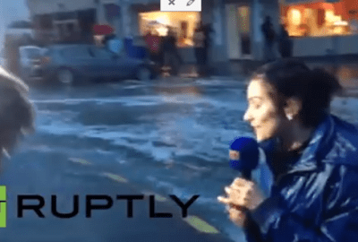 عرضت قناة “روسيا اليوم” مقطع فيديو لمذيعة بإحدى القنوات الفرنسية وهي تتعرض لموقف محرج أثناء تصوير برنامجها على الهواء أمام الكاميرا وسط أمواج في البحر، حيث ارتفعت الأمواج وأطاحت بالمذيعة أثناء التصوير وسقطت أرضا على ظهرها، ثم أسرع إليها زملاؤها ليطمئنوا عليها.