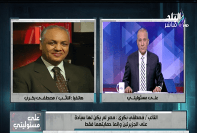 وعن جزيرتي “تيران وصنافير” قال بكري: “احنا كان عندنا وديعة ورجعناها لأصحابها، ولما الرئيس قال رسالة والدته بإنه ما ياخدش حاجة مش بتاعته، كان الرئيس وقتها بيعبر عن ثقافة شعبية”، مؤكدًا أنه في حالة وجود غاز طبيعي بالجزيرتين، ستحصل مصر على نصيبها من الغاز والذي يُقدَّر بـ50% منه.
