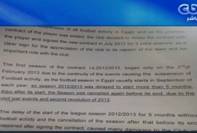 نفى المستشار القانوني لنادي الزمالك نصر عزام، ما تردد خلال الساعات الأخيرة، حول خطاب أرسله نادي الزمالك للمحكمة الدولية الرياضية بخصوص أزمة المستحقات المالية لمحمود فتح الله وعبد الواحد السيد، يتضمن جملة “حرب أهلية” في مصر.