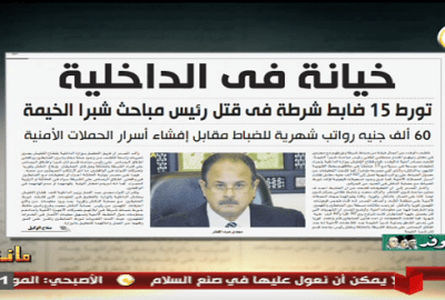 عرض الإعلامي جابر القرموطي، مانشيت جريدة “الوفد ” الذي جاء كالتالي “خيانة في وزارة الداخلية “، وهو عنوان الخبر الذي أكد تورط (15) من رجال الشرطة في قتل رئيس مباحث شرطة شبرا الخيمة.