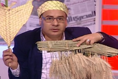 ظهر الإعلامي جابر القرموطي مرتديا تاج من السعف، وممسكاً بـ”سعف نخيل وبعض سنابل الغلال”، احتفالاً منه بأعياد المسيحيين التي بدأت هذا الإسبوع.