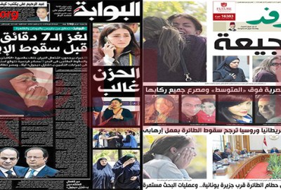 سيطر الحادث المؤسف الذي وقع لطائرة شركة مصر للطيران، التي أقلعت من مطار “شارل ديجول” بفرنسا واختفت وهي متجهة إلى مصر، على الصفحات الأولى للصحف المصرية، في أعدادها الصادرة غدًا الجمعة، حيث سلطت المانشيتات الرئيسية للصحف، الضوء على ما جرى للطائرة المنكوبة، والسيناريوهات التي ربما تكون قد تعرضت لها.