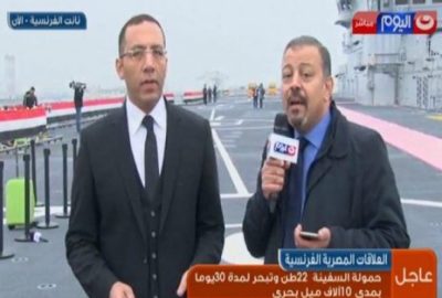 ونشر “الكحكي” من ميناء “سان نيزيز” بفرنسا، صورًا لفريق عمل تلفزيون ‘النهار”، على متن حاملة المروحيات الميسترال، التي تتسلمها مصر اليوم من فرنسا، حيث تواجد الإعلامي خالد صلاح، والمصور محمد يوسف.