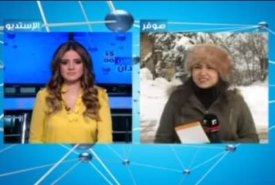 ظهرت مذيعة تلفزيون المستقبل اللبناني وهي ترتجف من البرد، خلال نقلها أحوال الطرقات المقطوعة بسبب العاصفة “زينة”.