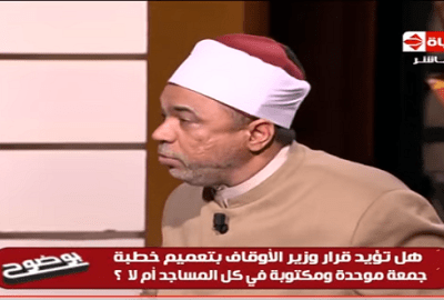 وأشار عميد كلية الدعوة الاسلامية إلى ان الأزهر الشريف يرفض قراروزير الاوقاف في أن تكون خطبة الجمعة موحدة ومكتوبة.