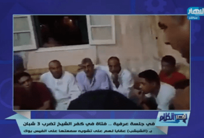 عرض برنامج “قصر الكلام” فيديو لإحدى الجلسات العرفية التي عقدت بسبب ثلاثة شباب قاموا بتشويه سمعة إحدى فتيات قريتهم عبر صفحات الفيسبوك، فكان الحكم النهائي للجلسة هو أن تقوم الفتاة بضربهم بـ”الشبشب”، رداً لكرامتها التي أهانوها.