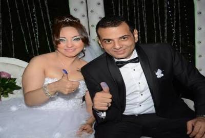 احتفلت الفنانة عايدة غنيم بعقد قرانها وزفافها إلى السيناريست أحمد عاشور، في إحدة الـ”فلل” على الطريق الصحراوي، بحضور عدد من الفنانين من بينهم “شعبان عبد الرحيم” الذي ارتدى بدلة حمراء و”تيشيرت” عليه صورة “جمجمة”، والفنانة “هندية”، وعمر خورشيد وزوجته ياسمين جيلاني، والراقصة هياتم التي ظهرت بنظارة لافتة للأنظار.