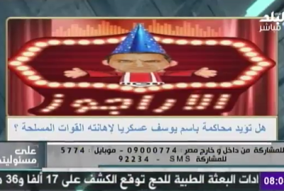 طلب أحمد موسى مقدم برنامج “على مسئوليتي”، محاكمة الإعلامي باسم يوسف، عسكريًا، على خلفية هجومة على القوات المسلحة، عبر صفحته على “فيس بوك”، بعد تدخلها لحل أزمة ألبان الأطفال، وطرح سؤالًا لمشاهديه حول تأييد محاكمة باسم يوسف عسكريًا من عدمه.