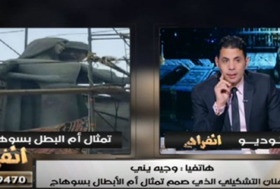 قال وجيه يني الفنان التشكيلي مصمم تمثال “أم البطل” الموجود مدينة البلينا جنوب محافظة سوهاج والذي أثار السخرية والنقد على مواقع التواصل الاجتماعي، إن التمثال كان لفلاحة مصرية تمد يدها لغصن الزيتون والجندي في صورة شهيد وكان متعلق بأمه عند استشهاده، وأنه لم يكن قد انتهى منه.