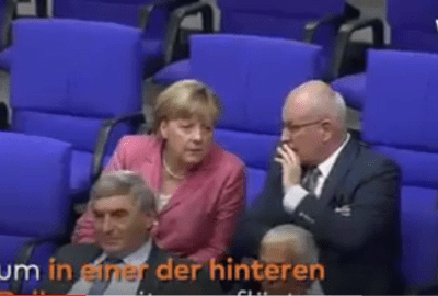 الفيديو يظهر ميركل تتحدث مع فولكر كاودر رئيس الكتلة النيابية للتحالف الديمقراطي المسيحي التي تتزعمه وينتمي إليه رئيس البرلمان أيضا خلال جلسة مناقشة الموازنة في البوندستاج