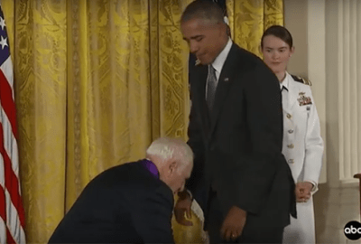 داعب المخرج والمنتج السينمائي الأمريكي ميل بروكس، الرئيس الأمريكي باراك أوباما، عن طريق سحب سرواله، وذلك عندما كان الأخير يسلمه وساما لمساهماته في الفن.