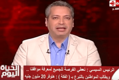 كما طالب مقدم برنامج “الحياة اليوم”، الرئيس السيسي بضرورة التنازل عن هذه الفكرة، مرجعًا ذلك:” رغم معرفتي بنية الرئيس من دعوته من أنه يريد أن يوقظ عند المصريين فكرة المشاركة والدعم في بناء مصر، قائلا “مصر ليست فكة ولن تتفكك، مصر ستظل “واحد صحيح”.