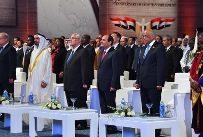 أنشد الحضور في الحفل الذي أقيم صباح اليوم الأحد بمدينة شرم الشيخ، بمناسبة “مرور 150 عامًا على الحياة النيابية في مصر”، بداية من الرئيس عبد الفتاح السيسي، وأعضاء مجلس النواب، مرورًا بالنواب العرب والأفارقة، النشيد الوطني المصري “بلادي لك حبي وفؤادي”، وذلك بعد تعطل عزف موسيقى السلام الوطني، بعد انتهاء السيسي من إلقاء كلمته.