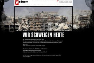 “نصمت اليوم”، جملة باللون الأبيض على صدر الموقع الالكتروني لمجلة “شتيرن” الألمانية، الذي اتشح بالسواد. إذ احتجب الموقع منذ صباح اليوم بعد أن قرر المسؤولون فيه عدم نشر أي موضوع، والاكتفاء بصور المأساة الدائرة في حلب وسوريا. وفي سطور قليلة يلحظها الزائر بين صور النار والدمار والخراب، قالت هيئة تحرير الموقع: “يجب على الصحفيين ألا يصمتوا. عليهم أن يصفون (المأساة) بالتقارير والتحليلات. وكلما أخذنا واجبنا بمزيد من الجدية، صعقتنا معاناة الناس في حلب وسوريا أجمع”.