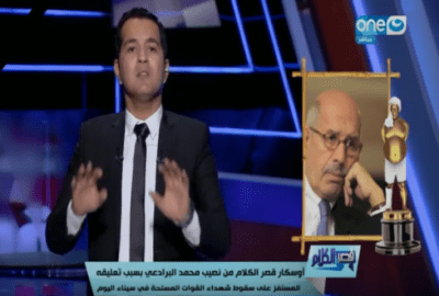 هاجم الإعلامي محمد الدسوقي رشدي، الدكتور محمد البرادعي، وأهدى له “أوسكار قصر الكلام”، الجائزة المهينة التي يهديها في برنامجه للشخصيات الفاشلة، وذلك بسبب تدوينة له على “تويتر” كتبها عصر اليوم الجمعة، بعد حادث استشهاد الجنود المصريين في سينا، قال فيها: ” رحم الله كل نفس ذهبت لخالقها، هل من عاقل يخرجنا من ظلام الكراهية والعنف المتبادل إلى نور التسامح والعيش المشترك، درءً لحريق لا يبق ولا يذر؟ ”