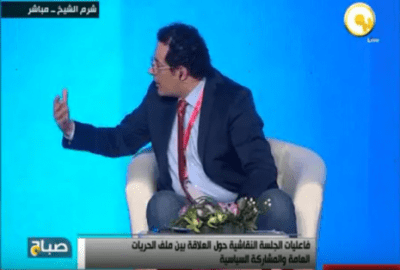 قام الإعلامي والمذيع بقناة cbc محمد عبد الرحمن، الذي يدير ندوة “العلاقة بين الحريات العامة والمشاركة السياسية” خلال المؤتمر الوطني للشباب بمقاطعة شاب قام بتعديد المواد الخاصة بالحقوق والحريات في الدستور المصري الحالي، ليُظهر مدى تعارض هذه النصوص مع ما يحدث في الواقع، ليقاطعه عبد الرحمن قائلًا: “حضرتك مش شايف إن دا كلام نظري شوية.. إحنا في مرحلة أشبه بمرحلة الحرب”، ومن ثم انتقل إلى الشاب الآخر ليوجه له سؤالا آخر.