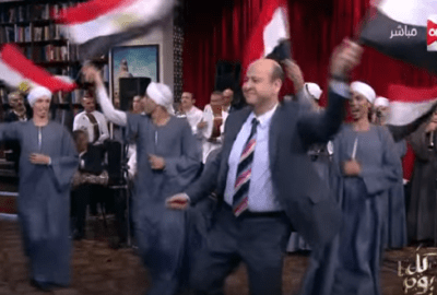 ظهر “أديب” في حلقة اليوم الأحد من برنامجه الذي يُعرض عبر شاشة “ON E”، وهو “يرقص” ممسكًا بالأعلام المصرية، مع المطرب الشعبي، الذي أشعل الاستديو بالأغاني الوطنية والشعبية.