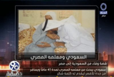 من جانبه، قال عبد الله القهار المواطن السعودي، خلال مداخلة هاتفية بحلقة اليوم السبت، من برنامج “٩٠ دقيقة”، الذي يقدمه الإعلامي معتز الدمرداش عبر شاشة “المحور”، إن معلمه المصري والذي يدعى عبد المنعم القاضي، كان يدرس له بالمملكة العربية السعودية، وهو في الصف الأول والثاني الإبتدائي، وعلمه الكثير في كيفية القراءة والكتابة وحفظ القرآن الكريم، مما دفعه للبحث عنه وتوجيه الشكر لك.