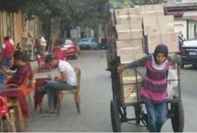 صورة لفتاة تجر عربة محملة بالبضائع انتشرت بشكل كبير على شبكات التواصل الإجتماعي.. لم يكن السبب الرئيسي لانتشار الصورة هو الفتاة، بل ربما كان الشابان الذين يجلسان خلفها على أحد المقاهي، ويجسدان معنى “البطالة”!