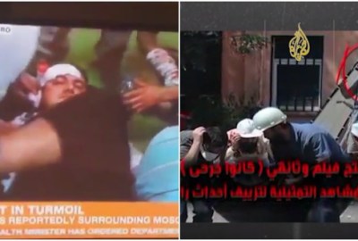 كما ركز الفيديو على بعض الوقائع التي نقلتها الجزيرة، واتضح من خلالها التزييف، مثل إعلان الجزيرة، أن قوات الأمن المصرية، أطلقت قنابل الغاز داخل مسجد الفتح، وفي نفس الوقت أظهرت الكاميرات الناقلة، فتح أحد الموجودين بالمسجد، “طفايات الحريق” ليظهر دخانها الأبيض وكأنه أدخنة قنابل الغاز.
