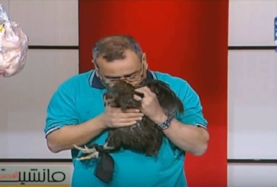 أمسك “القرموطي” بفرخة مستوردة تم تعليقها فى ديكور “فرارجى القرموطي”، قائلاً “هذه الفرخة المستوردة هتبقى فوق كل المصريين بعد ما تم رفع الجمارك عنها “، وأمسك أيضا بفرخة بلدي واحتضنها وقام بتقبيلها على الهواء.