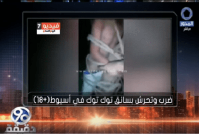 عرض الإعلامي معتز الدمرداش، فيديو مصورًا يظهر فيه سائق “توك توك” بإحدى القرى بمركز الفتح في محافظة أسيوط، يتعرض فيه للتعذيب والضرب الوحشي بالإضافة إلى تجريده من ملابسه، بسبب مكالمة هاتفية لفتاة من القرية، منوهًا أن المقطع المصور يحتوي على مشاهد تعذيب، لذا يجب إبعاد الأطفال عن شاشة “المحور”.
