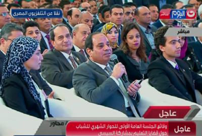 تدخل الرئيس عبد الفتاح السيسي مدافعًا عن إحدى المشاركات في جلسة الحوار الشهري الأولى للشباب، وتُدعى هبة سامي، في أثناء جلسة مناقشة قضايا التعليم.
