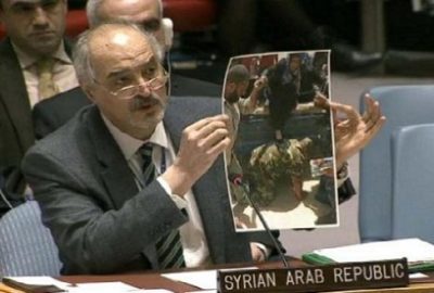 عرض المندوب السوري في مجلس الأمن، بشار الجعفري، صورة لجندي يساعد سيدة على النزول من عربة على أنها من مدينة حلب، وذلك في قلب المؤسسة الدولية، كمحاولة للدفاع عن ممارسات قوات بلاده في المدينة، ليتضح أن الصورة تعود حقيقة إلى العراق، وذلك وفقا لموقع “CNN بالعربية”