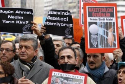 كما ذكّرت رسالة جمعية حماية الصحفيين بعملية اعتقال رئيس تحرير جريدة “زمان” التركية أكرم دومانلي، ورئيس مجموعة قنوات “سمان يولو” هدايت كاراجا، الذي لا يزال معتقلًا حتى اليوم، لافتة إلى أن السلطات التركية وجهات التحقيق لم تقدم أية أدلة إدانة حقيقية تدين أكرم دومانلي أو هدايت كاراجا في التهم الموجهة إليهما.