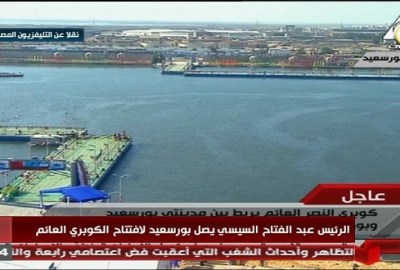عبر الرئيس السيسي، يجاوره الفريق مهاب مميش، رئيس هيئة قناة السويس، ومجموعة من الشباب، كوبري النصر العائم لتفقد طريقة تشغيله بعد أن تم ربط جسري الكوبري.
