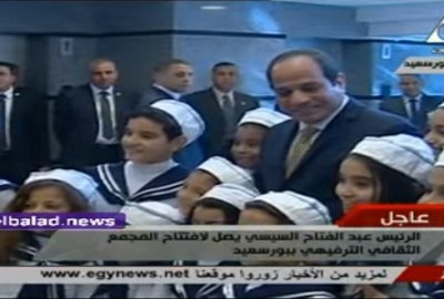 استقبل الرئيس عبدالفتاح السيسي، عدد من أطفال بورسعيد، على مدخل مبنى أوبرا بورسعيد، حاملين الأعلام المصرية، كما استقبله عدد من الأطفال برقصة السمسمية، مرتدين زي قبطان المراكب.