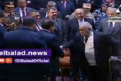 فيما قاطع أحد أبطال المقاومة في مدينة بورسعيد كلمة الرئيس السيسي، قائًلا: “اسمح لي أجي أبوس ايدك”، ليرد عليه الرئيس قائًلا: “استغفر الله.. أنا أجي اسلم على حضرتك”، وبعد انتهاء كلمة الرئيس توجه إليه ليقوم أحد أبطال المقاومة باحتضانه ومحاولة تقبيل يده.