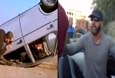 السقا يحاول إطفاء سيارة مشتعلة على الطريق الصحراوي