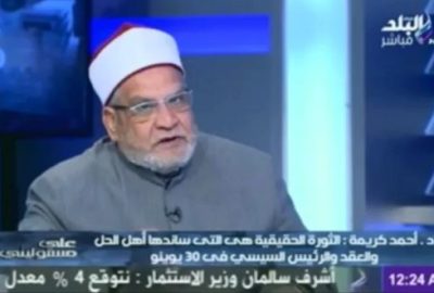 في حلقة مساء السبت من برنامج “على مسئوليتي” الذي يُقدمه الإعلامي أحمد موسى على قناة صدى البلد، إستضاف موسى الشيخ أحمد كريمة و اللواء محمد نور الدين ووضح كريمة أن من يموت على جرائم إعتداء على الأموال و الأعراض ليس شهيداً، و 25 يناير أحداث أو (إنتفاضة) و ليست ثورة، لكنها كانت ضرورة و مقدمة لما بعدها، والثورة الحقيقية هى 30 يونيو