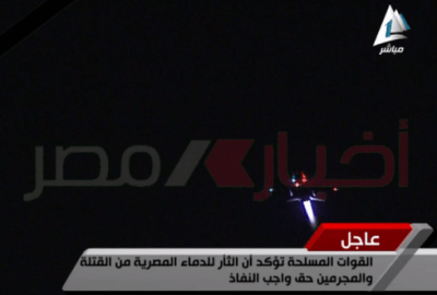 أذاع التليفزيون المصري الرسمي، أولى لحظات إقلاع الطائرات الحربية المصرية، من قواعدها، واستعدادها لضرب معاقل تنظيم داعش الإرهابي في ليبيا، بالإضافة إلى إذاعة بيانًا للقوات المسلحة، يفيد بأنه في فجر اليوم الاثنين، قامت القوات الجوية، بتوجيه ضربة جوية مركزة ضد مناطق تمركز ومراكز تدريب ومخازن أسلحة، تابعة للتنظيم الإرهابي.