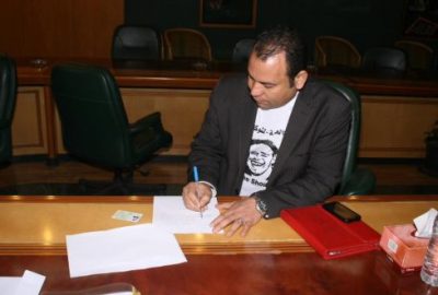ارتدى الكاتب الصحفي عبد الجواد أبو كب، رئيس تحرير بوابة “روزاليوسف “، قميص عليه صورة للمصور الصحفي محمود شوكان، المعتقل منذ أكثر من عام تقريبًا، وذلك أثناء توجهه بأوراق ترشحه لعضوية مجلس نقابة الصحفيين تحت السن.
