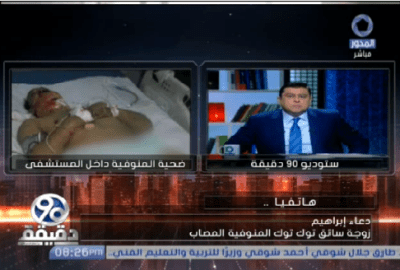 أضافت “إبراهيم” خلال مكالمة هاتفية مع الإعلامي معتز الدمرداش، في برنامج “90 دقيقة” الذي يذاع عبر فضائية “المحور”، مساء اليوم، الثلاثاء، أن زوجها يمر بحالة سيئة نتيجة عدم وجود دم ويحتاج إلى تدخل طبي سريع، مطالبةً بالتدخل السريع من قِبل وزير الصحة ووزير الداخلية بمساعدة زوجها، موضحة أنه يحتاج إلى نقل دم، قائلة “بيجيب دم من كل حتة ما بقاش فيه وش أصلا”.