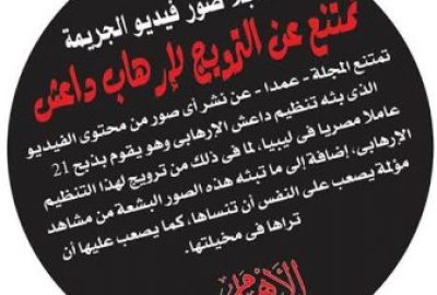 وقالت المجلة التي يرأس تحريرها الزميل علاء العطار في بيان لها، أن العدد الجديد لن يتضمن الصور لما في ذلك من ترويج للتنظيم الإرهابي، بالإضافة إلي ما تبثه هذه الصور البشعة من مشاهد مؤلمة يصعب على النفس ان تنساها كما يصعب عليها أن تراها في مخيلتها.