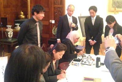 أقام السفير الياباني بمصر كاجوا تاكيهيرو، حفل استقبال بمنزله بالقاهرة مساء أمس السبت وذلك بمناسبة افتتاح معرض للخط العربي للدارسين اليابانيين، تحت إشراف الخطاط المصري مجدي هليل.