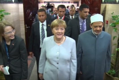 رحب الإمام الأكبر بالمستشارة الألمانية فى رحاب الأزهر الشريف، مشيدًا بالعلاقات الوطيدة التى تجمع بين مصر وألمانيا بصفة عامة والأزهر بصفة خاصة، وأعرب عن تقديره لموقف ميركل الإنسانى من الفارِّين من مناطق الحروب والنزاعات فى الشرق، مشيرًا إلى أن الأزهر أصدر بيانًا شكر فيه المستشارة ميركل على أريحيتها الكريمة تجاه الإسلام والمسلمين حين شاركت سيادتها فى مظاهرات برلين المندِّدة بالإسلاموفوبيا.