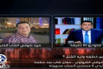 عرض الإعلامي معتز الدمرداش، فيديو مصورًا، عبر برنامجه “90 دقيقة” الذي يُبث عبر فضائية “المحور”، مساء اليوم السبت، يظهر فيه مواطن يُدعى فريد شوقي، يستغيث من داخل السيارة المُختطف فيها، بالمارة في شارع شهاب بالمهندسين، بعد عثور أسرته عليه مقتولًا في منطقة شبين القناطر بالقليوبية.