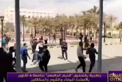 عرضت الإعلامية إيمان الحصري، خلال حلقة اليوم السبت، من برنامجها “مساء dmc”، المُذاع عبر فضائية (dmc)، فيديو لمجموعة من البلطجية، الذين اقتحموا حرم جامعة 6 أكتوبر، يوم الأربعاء الماضي، بالأسلحة البيضاء