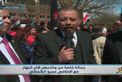 ظهر الكحكي وخلفه بعض الأفراد من الجالية المصرية وهم يرفعون الأعلام المصرية من أمام مقر إقامة السيسي في واشنطن، مرددين بعض هتافات التأييد، كما أجرى حوارات مع حسين أبو جاد النائب البرلماني عن دائرة كوبري القبة المتواجد في الولايات المتحدة الآن، وسليمان وهدان، وكيل مجلس الشعب.
