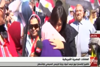 فيما تأثرت إحدى المصريات “أمال”، القادمة إلى أمريكا لزيارة عمتها، فقررت المشاركة لاستقبال السيسي، حد البكاء، أثناء حديثها عن الرئيس قائلة، “إن شاء الله منصور، وربنا هينصره على الإرهاب، والحاقدين وأعداء مصر، ربنا واقف جمبنا، مهما جرى، وراضيين بكل اللي يعمله الريس، وواقفين معاه”.