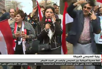 ظهر على الشاشة بعض المواطنين المصريين وهم يحملون بعض الطبول وقدم أحدهم عرض “أبو الغيط” ثم رقص بالعصا على دقات الطبول. بينما رفع عدد منهم أعلام مصر وصور السيسي ورددوا بعض شعارات الترحيب به.