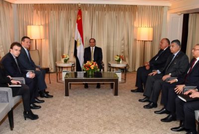 كما أكد السيسي أن جهود مصر في تسوية الأزمات القائمة بالمنطقة تستند إلى ضرورة تدعيم أركان الدول التي تمر بأزمات وتقوية مؤسساتها الوطنية، بما ينهي معاناة شعوبها ويحافظ على مقدراتها، فضلاً عن ملء الفراغ الذي أتاح للجماعات الإرهابية التمدد والانتشار.