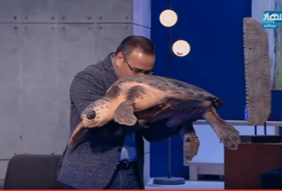 استضاف الإعلامي جابر القرموطي، سلحفاة تحمل اسم “حمص”، تبلغ من العمر 50 عامًا تقريبًا، وهي من فصيلة “سكرية المنقار” إحدى الأنواع النادرة، والمُشتري “إيهاب”، ليكشف عن تفاصيل عملية الشراء، وكيف يتعامل معها.