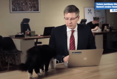 اقتحمت قطة بثا مباشراً على موقع « فيسبوك » لعمدة ريغا، عاصمة لاتفيا، ولم تكتف بذلك بل توجهت إلى كوب الماء الموضوع إلى جواره، وشربت منه أثناء تلقيه أسئلة من الجمهور.